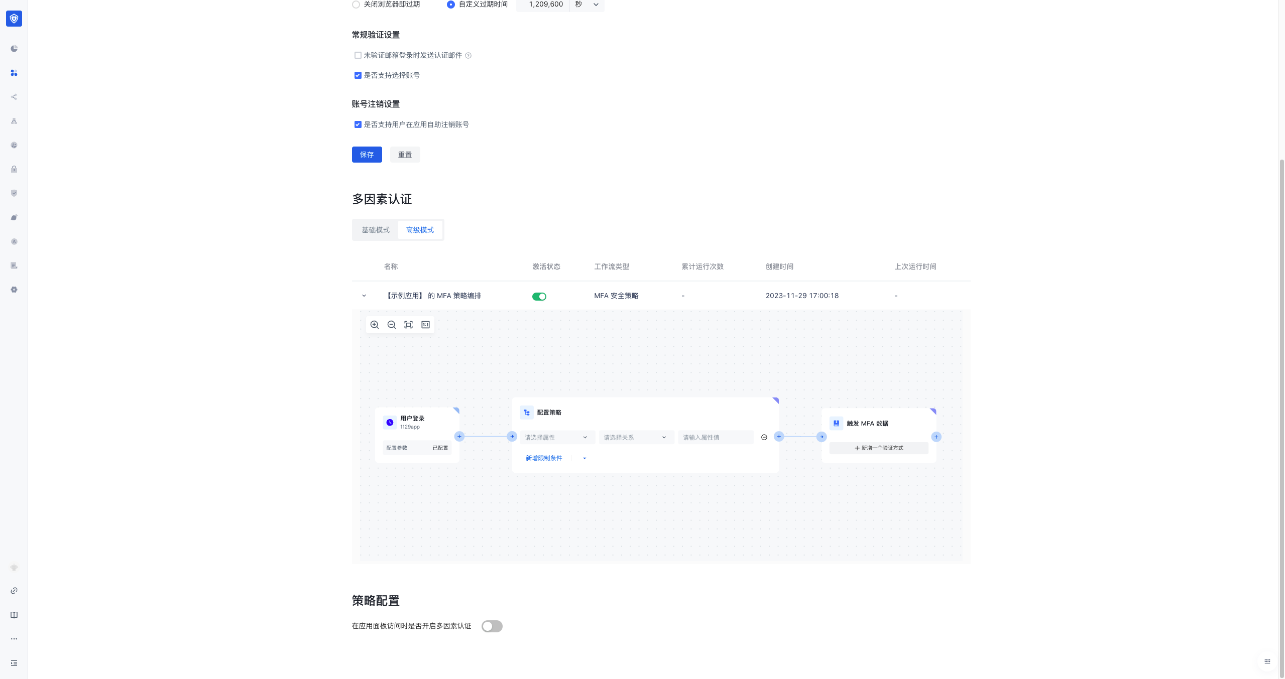 - 在应用详情中点击安全管理,找到多因素认证模块,点击高级模式,可以看到 MFA 安全策略编排的工作流。