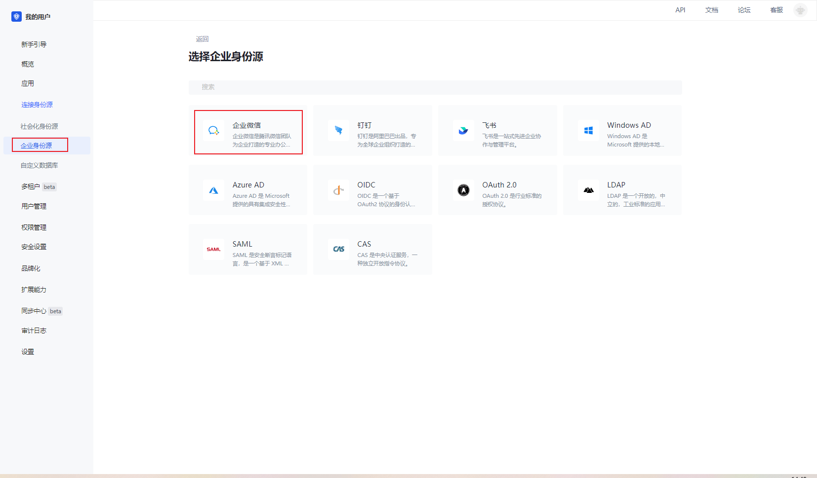 - 选择 Authing 身份源管理->企业身份源,在 企业身份源 页面点击 创建企业身份源 按钮,进入 选择企业身份源 页面,点击 企业微信 身份源。