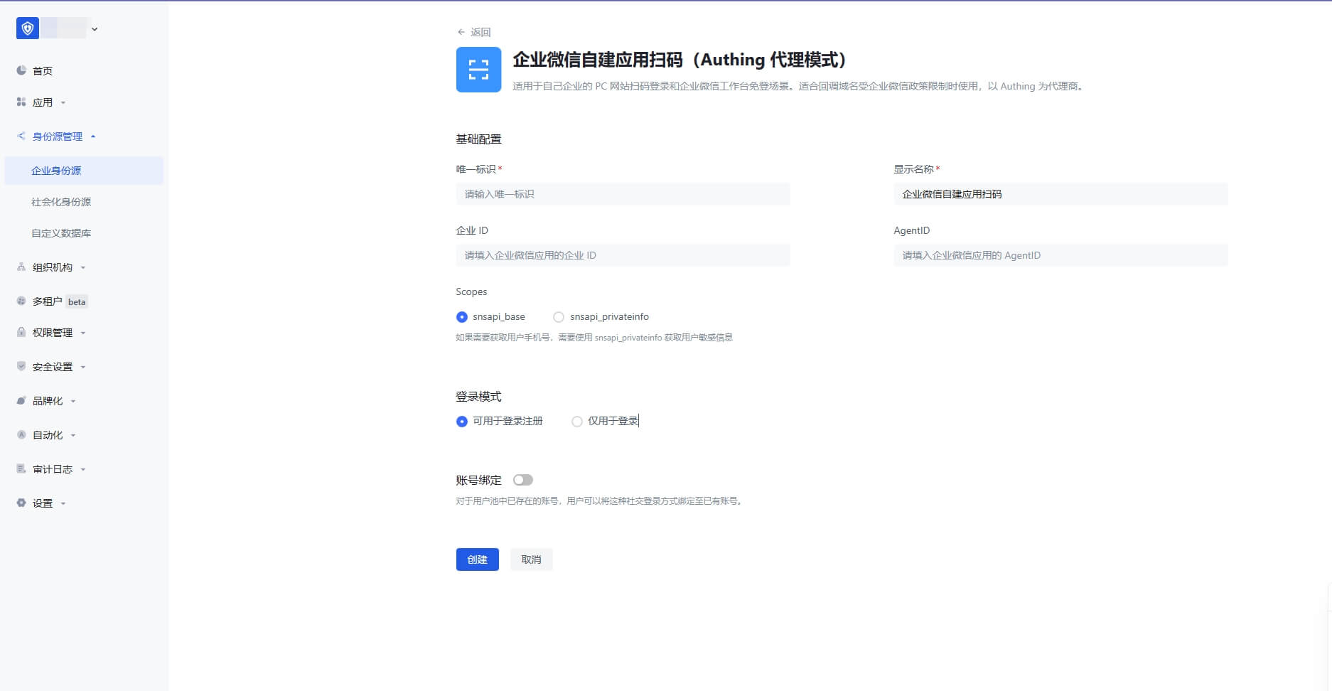 ¶ 第二步:在 Authing 控制台配置企业微信自建应用扫码(Authing 代理模式)