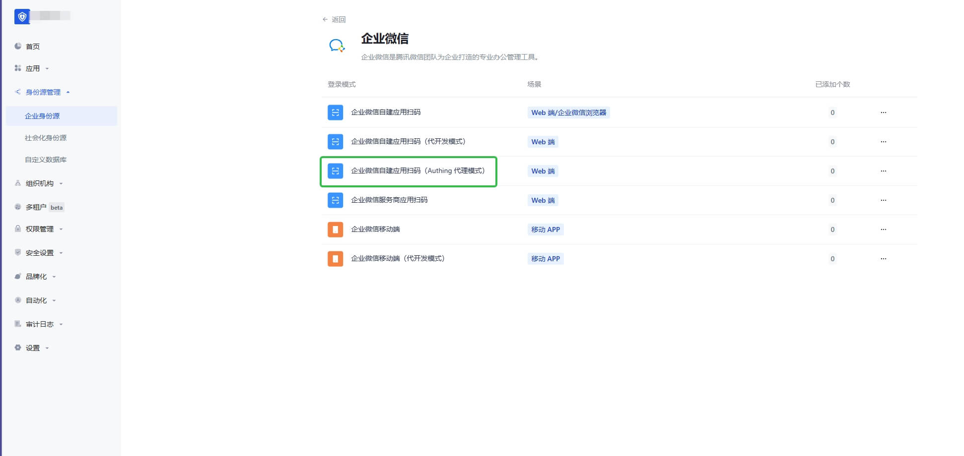 - 选择 企业微信自建应用扫码(Authing 代理模式)。