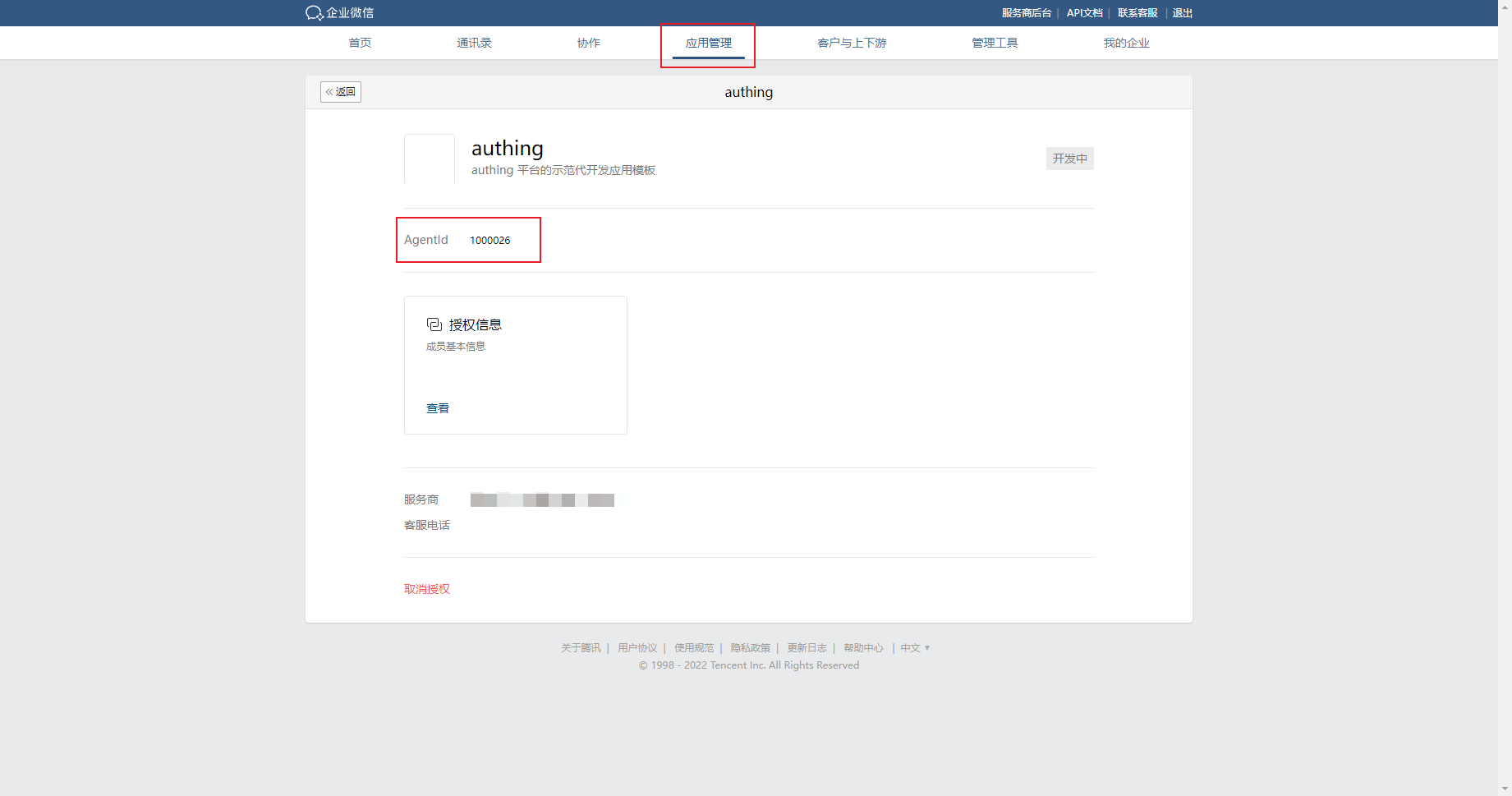 - 在授权企业的企业管理后台 应用管理->应用 中找到新建的应用,进入应用详情, 拷贝 AgentId 到 Authing 控制台 企业微信自建应用扫码(Authing 代理模式) 页面的 AgentId 字段 中。