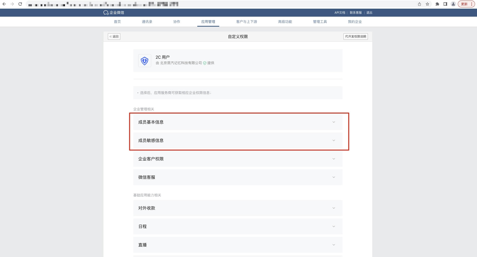 - 点击进入页面下方 授权信息,点击 自定义权限,添加允许的成员敏感信息。