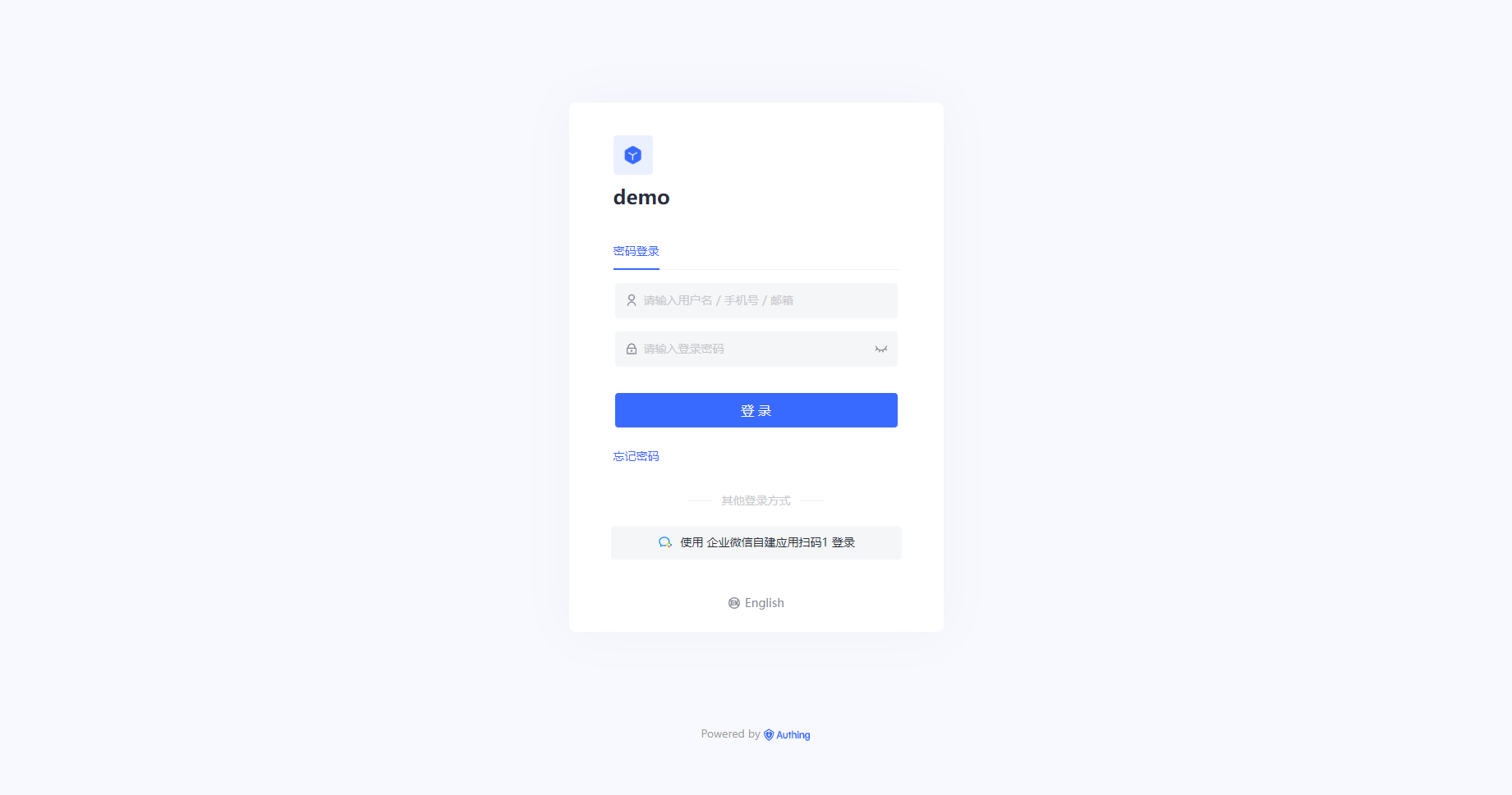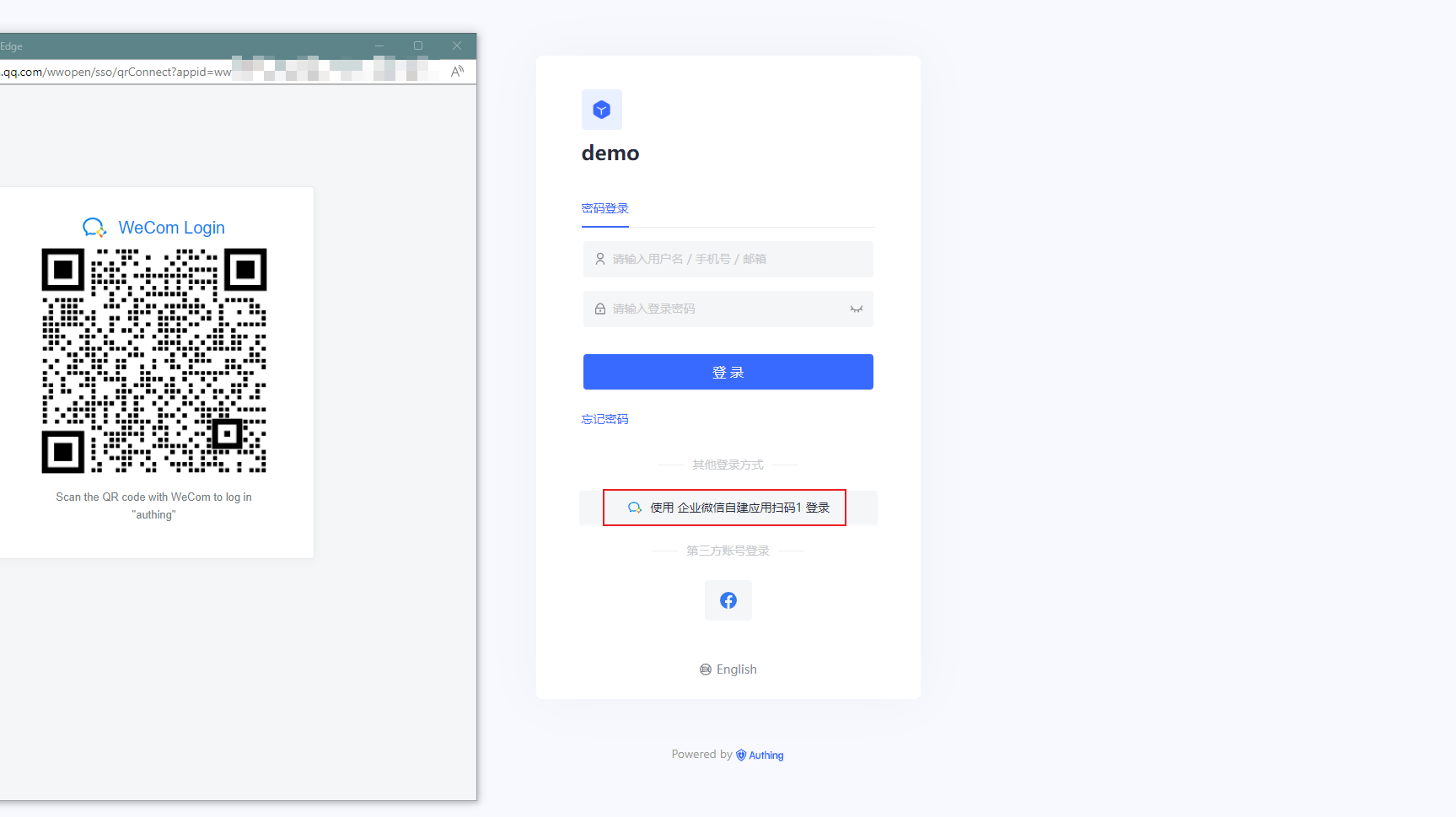 - 在登录页面体验企业微信自建应用扫码(Authing 代理模式)第三方登录。