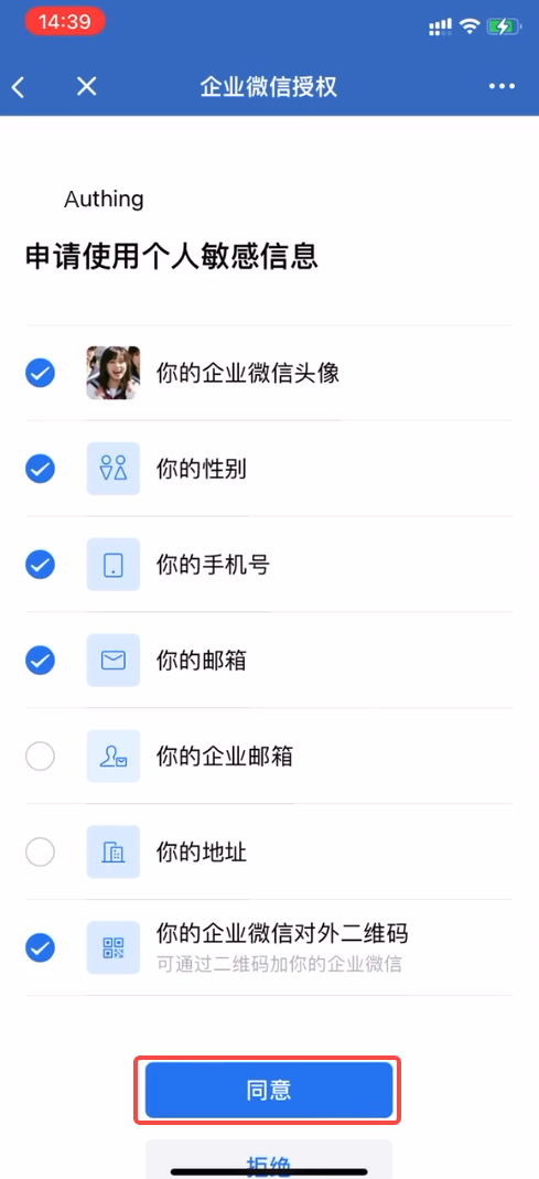 - 在打开的 企业微信授权 页面勾选允许 Authing 访问的用户个人敏感信息,点击 同意。