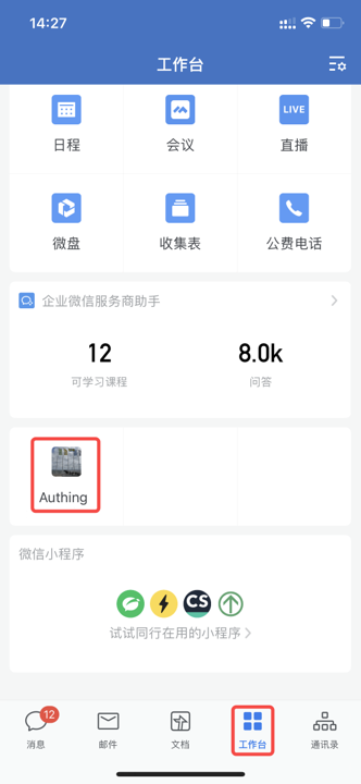登录企业微信,访问 工作台。
