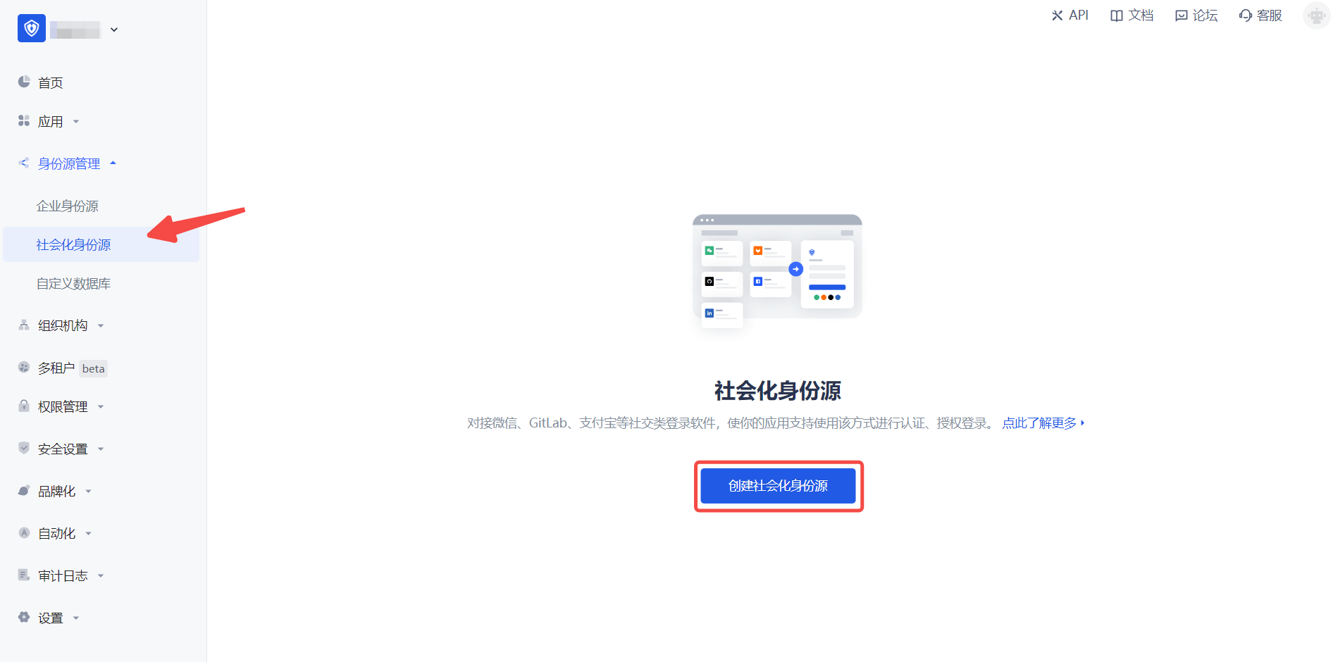2.1 请在 Authing 控制台 的「社会化身份源」页面,点击「创建社会化身份源」按钮,进入「选择社会化身份源」页面。