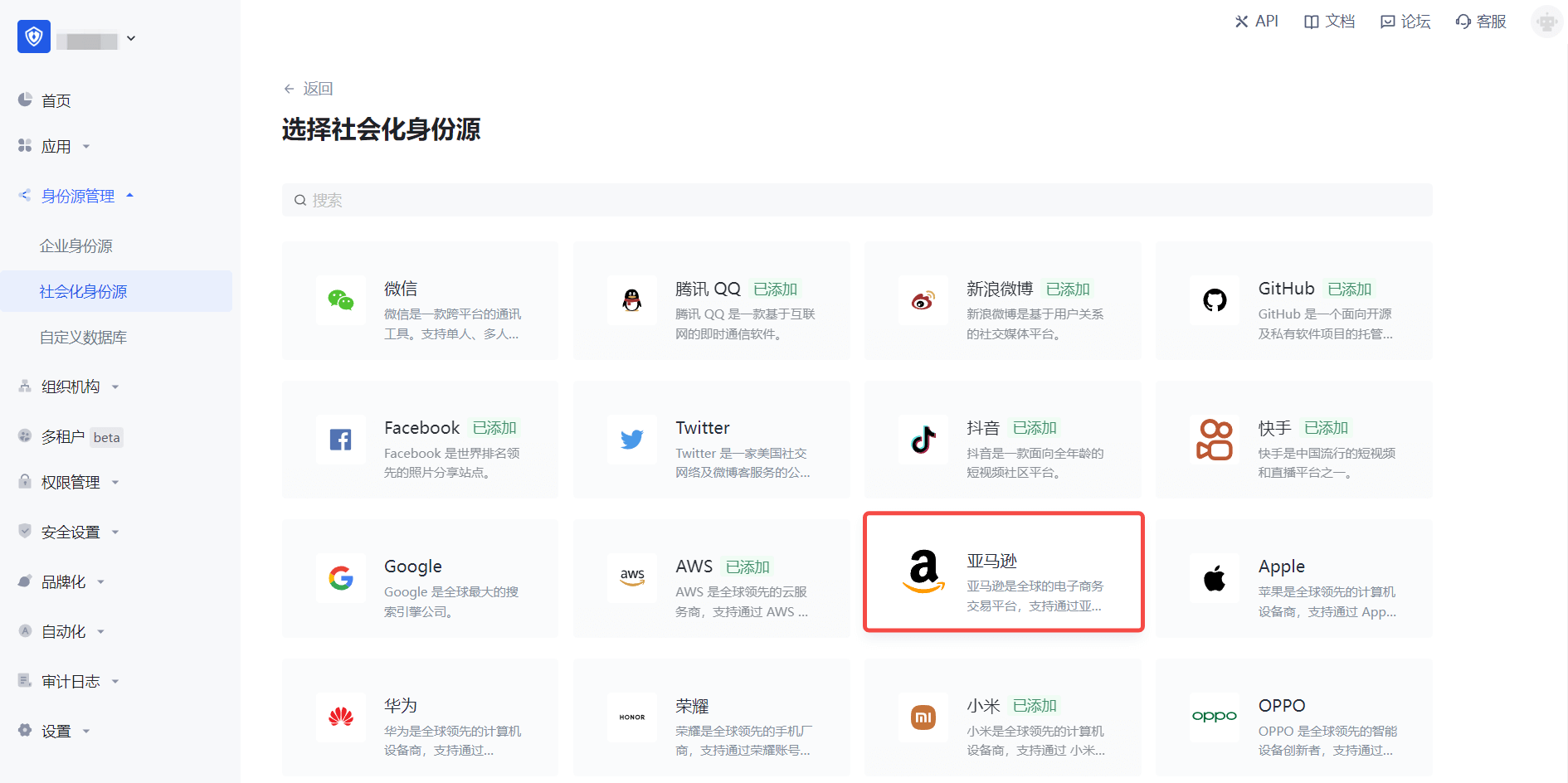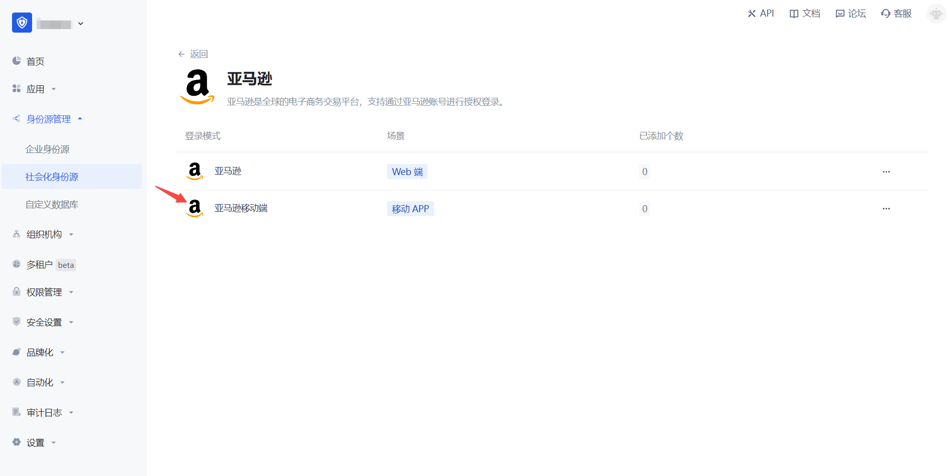 2.2 请在 Authing 控制台 的「社会化身份源」-「选择社会化身份源」页面,点击「亚马逊」身份源按钮,进入「亚马逊移动端登录模式」页面。