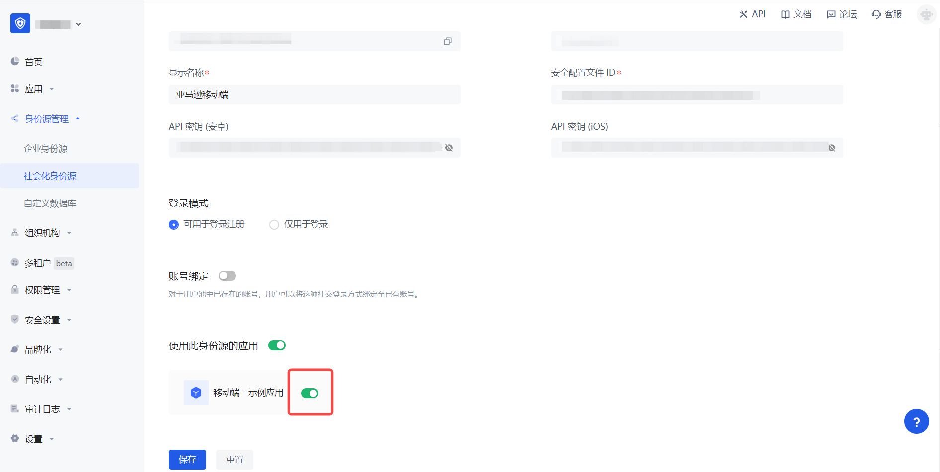 3.2 在已创建好的「亚马逊移动端」身份源连接详情页面,开启并关联一个在 Authing 控制台创建的应用