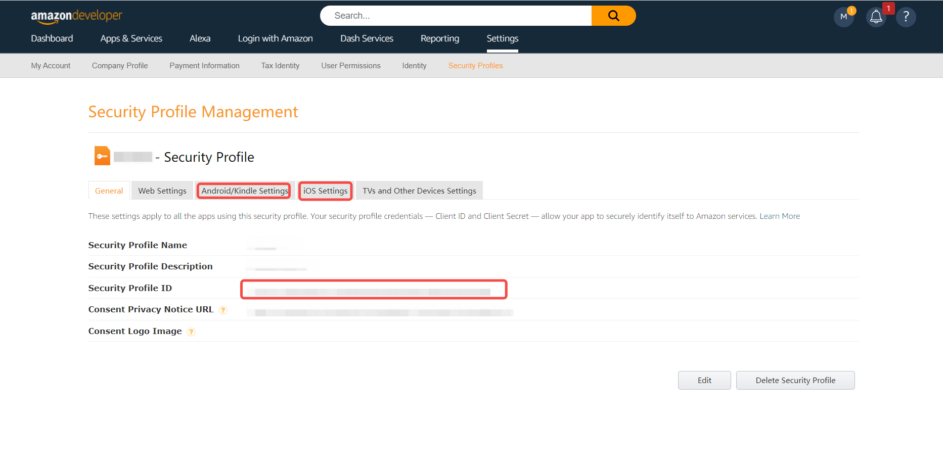 1.2 记录 Security Profile ID, 并分别配置 Android 和 iOS 设置