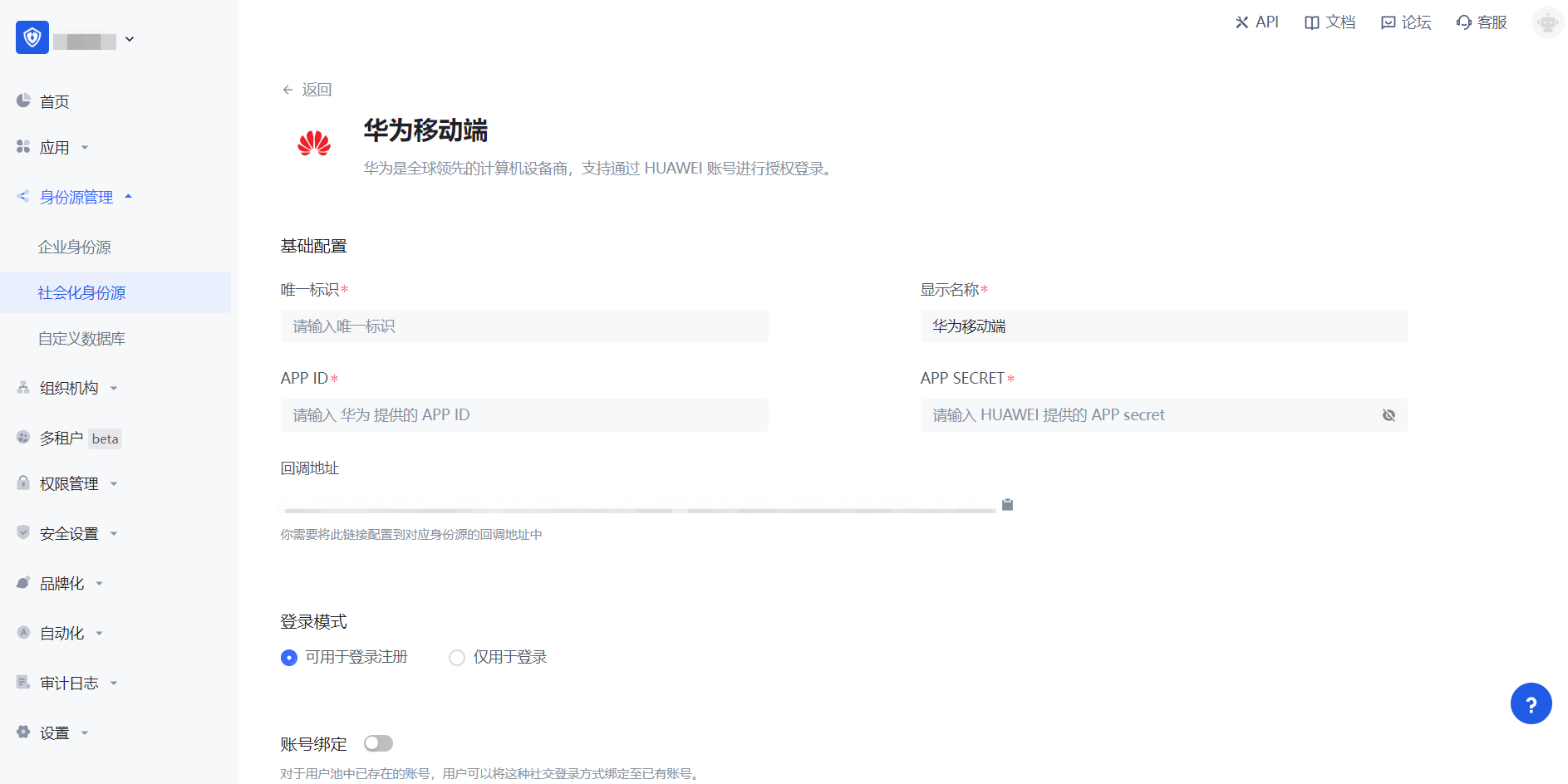 华为 社会化登录是用户以 华为 为身份源安全登录第三方应用或者网站。在 Authing 中配置并开启 华为 的社会化登录,即可实现通过 Authing 快速获取 华为 基本开放的信息和帮助用户实现免密登录功能。