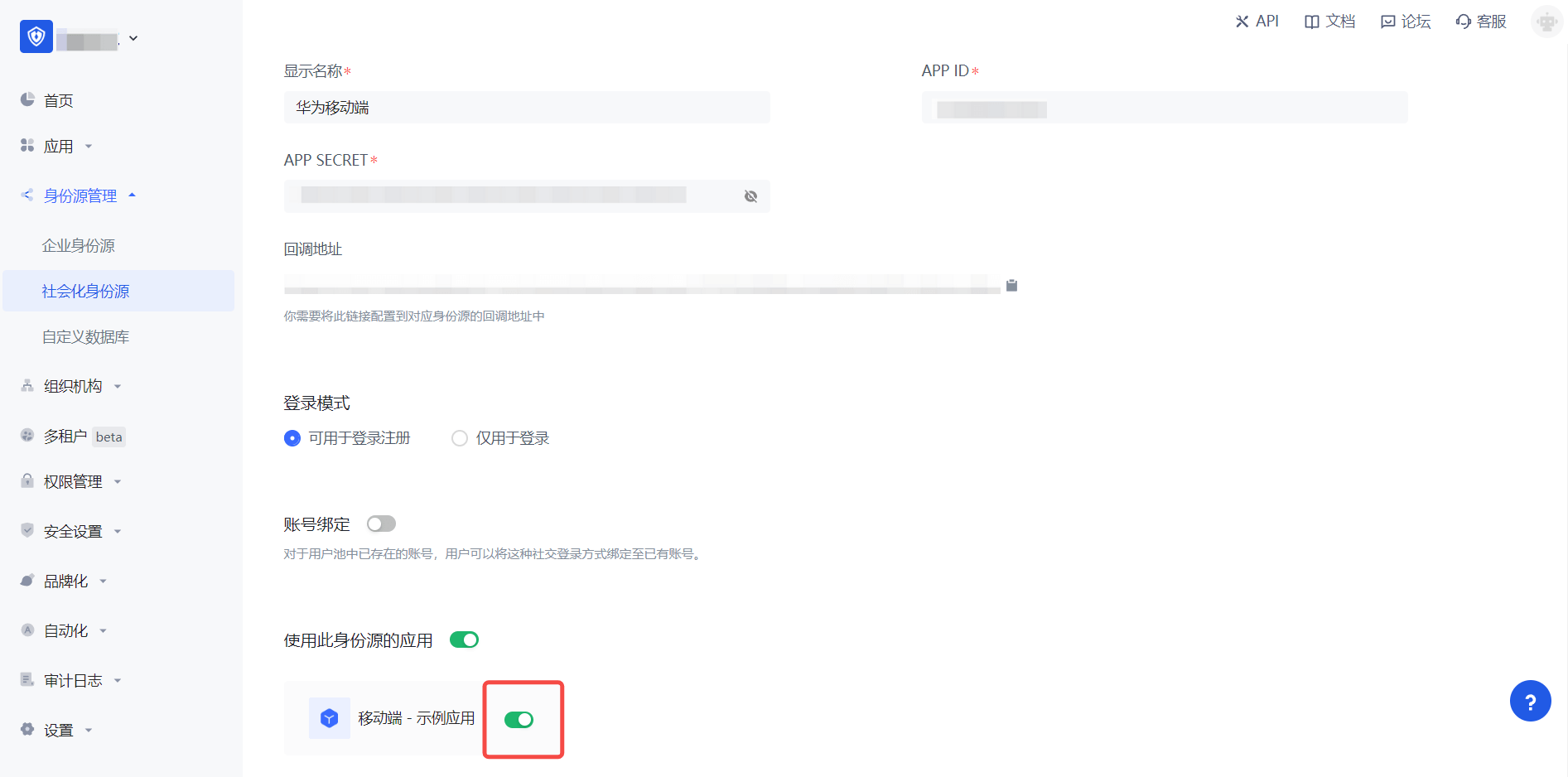 3.2 在已创建好的「华为移动端」身份源连接详情页面,开启并关联一个在 Authing 控制台创建的应用