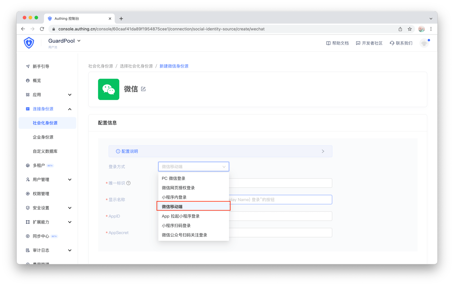 - 在控制台的 “连接身份源” 菜单选择 “创建社交身份源“