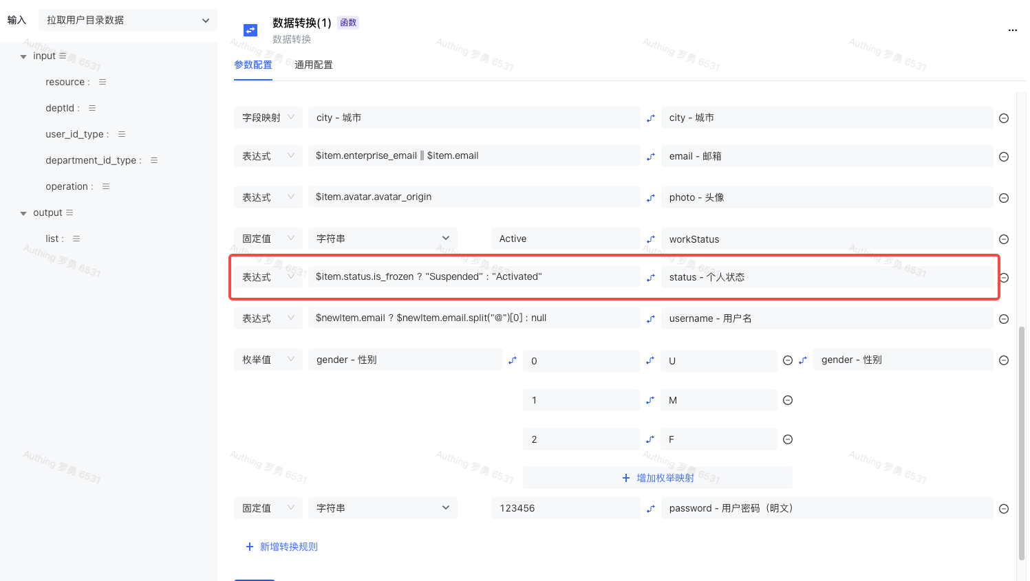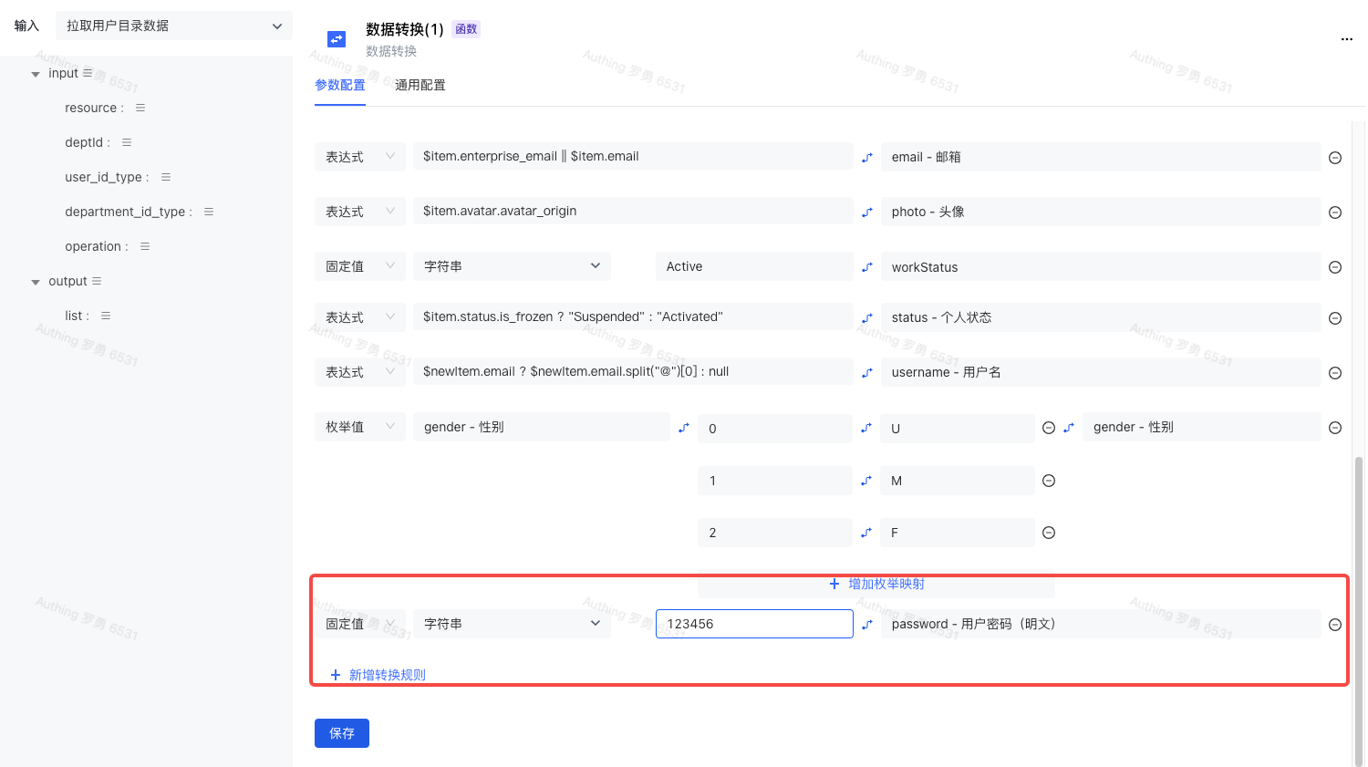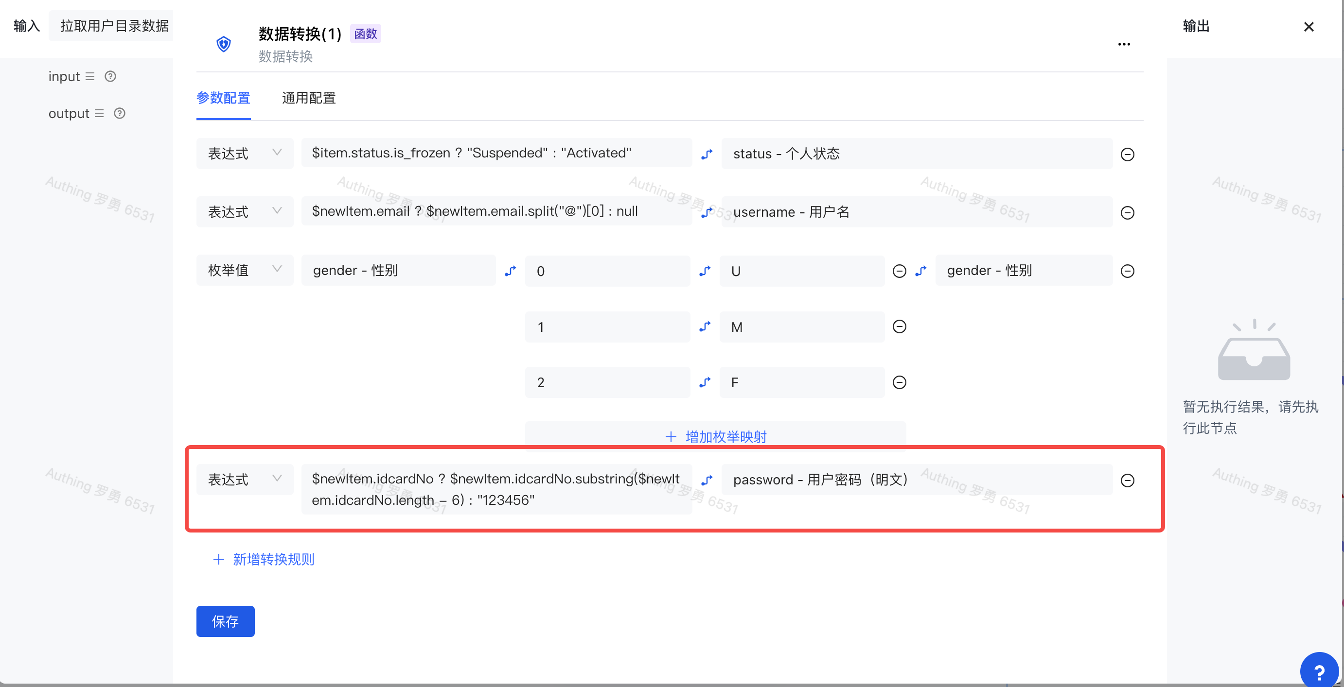 在「数据转换」节点中,新增一条转换规则,类型选择「表达式」,然后在后面的输入框中输入 $newItem.idcardNo ? $newItem.idcardNo.substring($newItem.idcardNo.length - 6) : '123456'(当身份证号码不存在时,采用默认密码:123456),映射的字段输入或选择 password 即可。