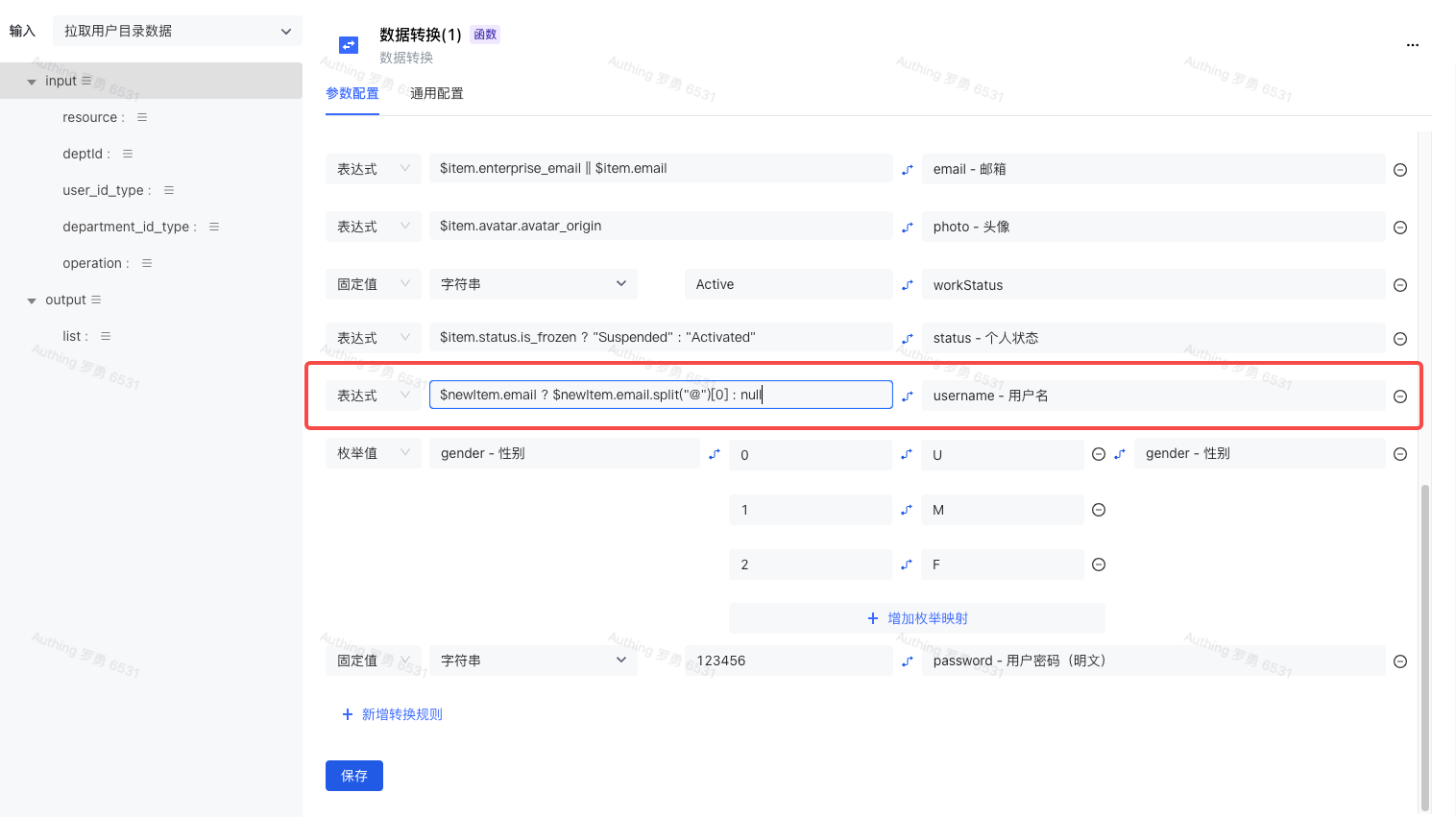 在「数据转换」节点中,找到或者新建一条「username 用户名」 转换规则,在类型中选择「表达式」,在输入框中输入 $newItem.email ? $newItem.email.split("@")[0] : null ,在映射的字段中输入或选择 username 即可。