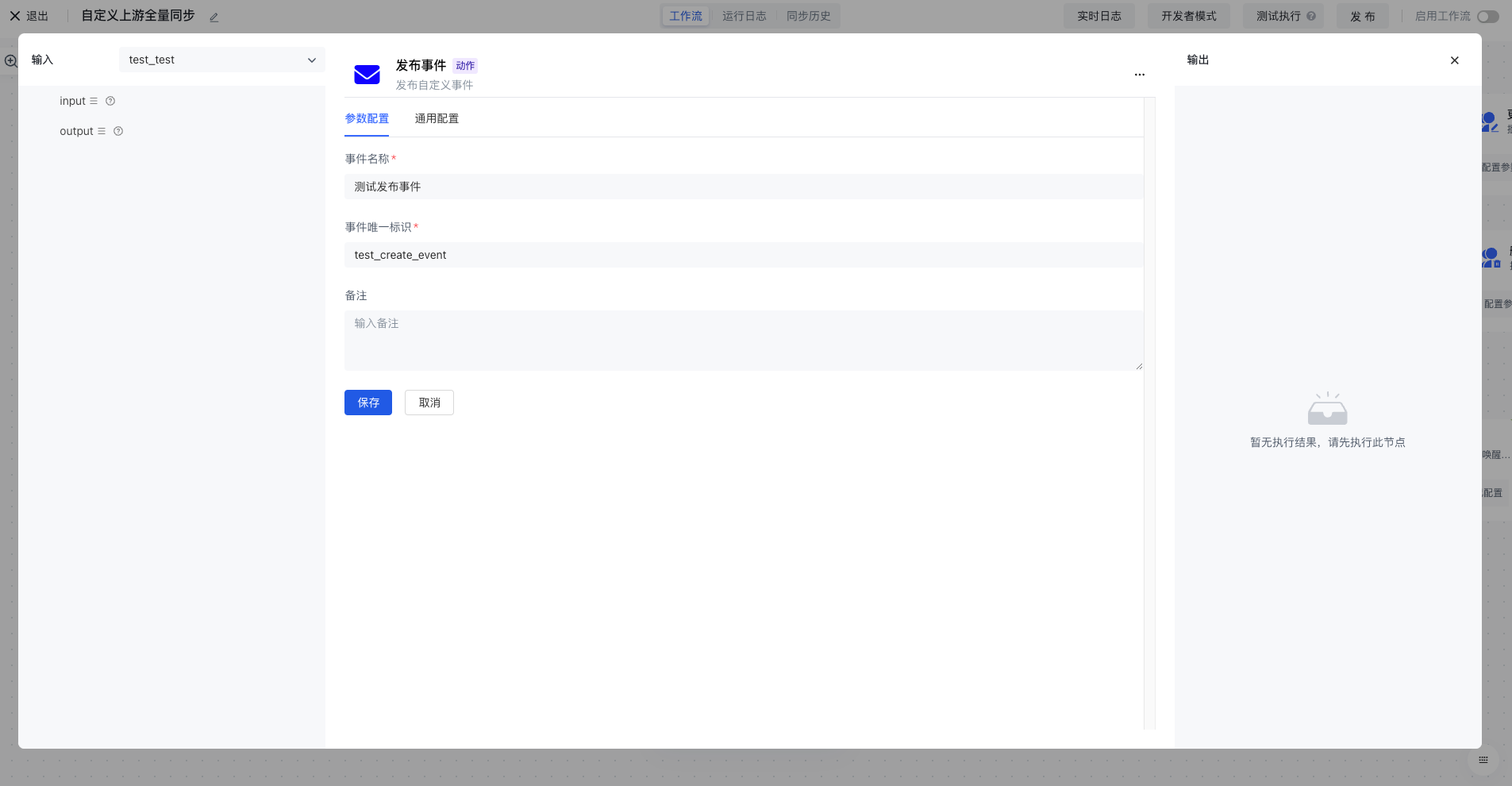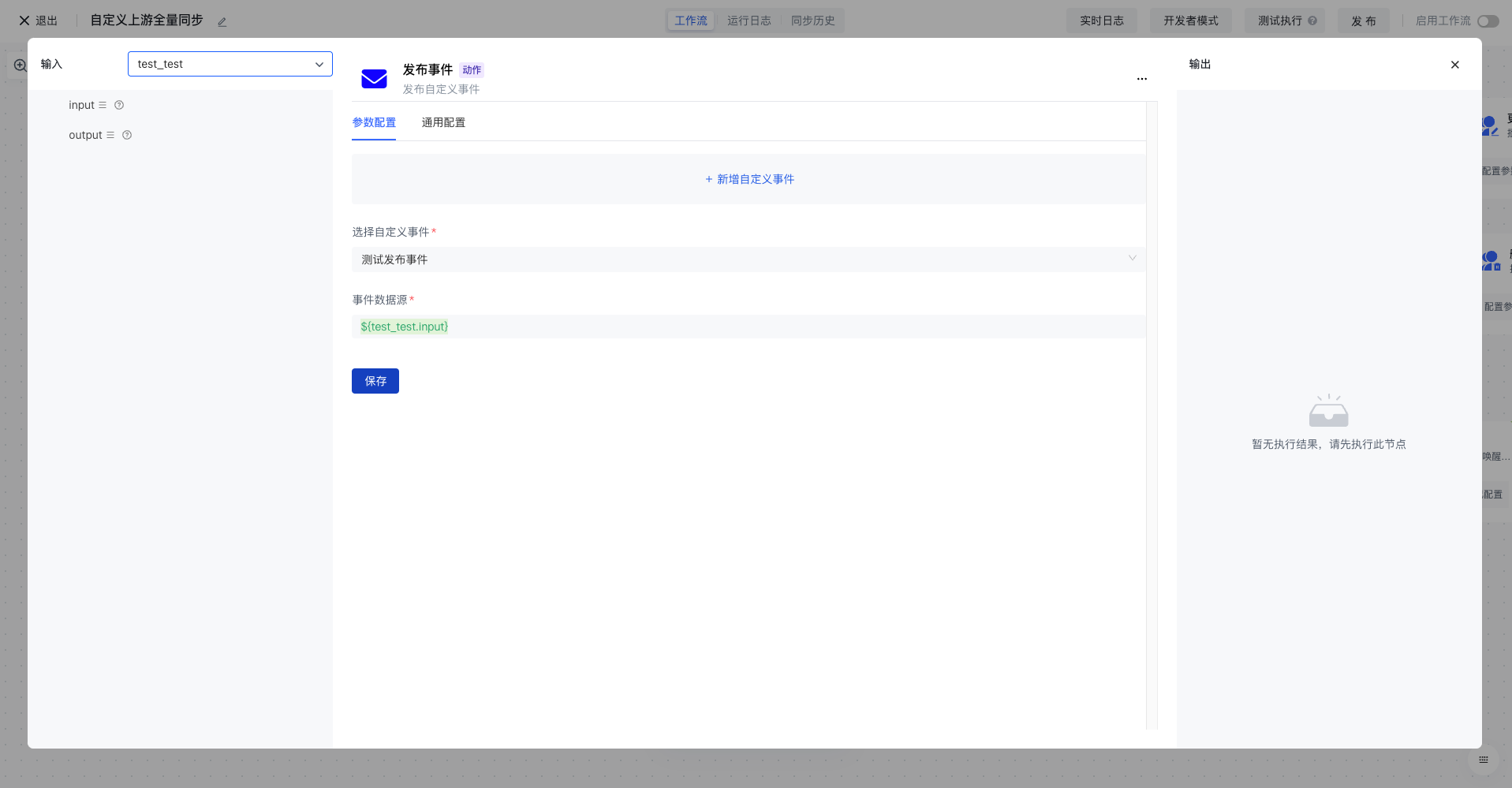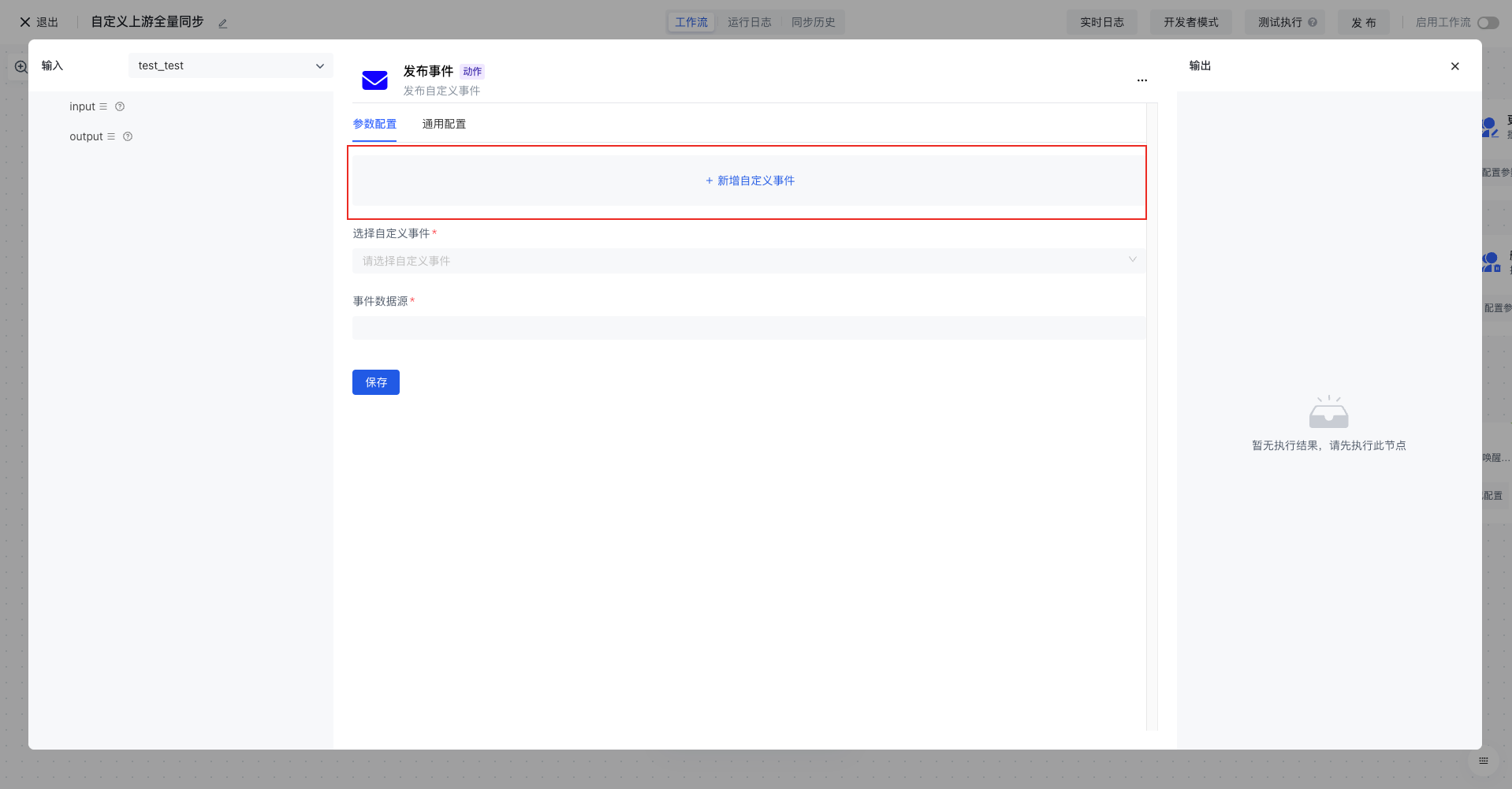 点击发布事件节点后,点击新增自定义事件,对自定义事件相关信息进行配置并点击保存。