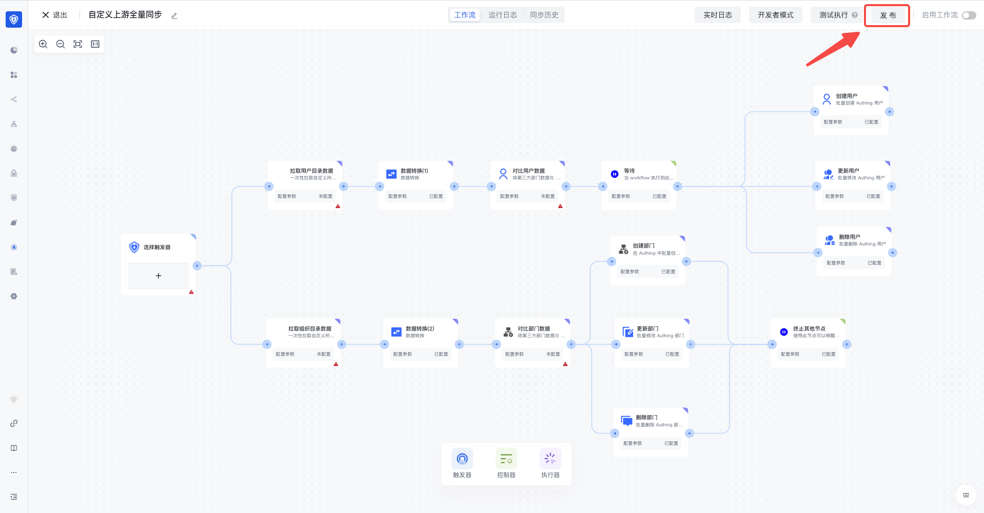 - 当该用户池开启模板发布权限时,工作流画布页面右上角会出现发布按钮。