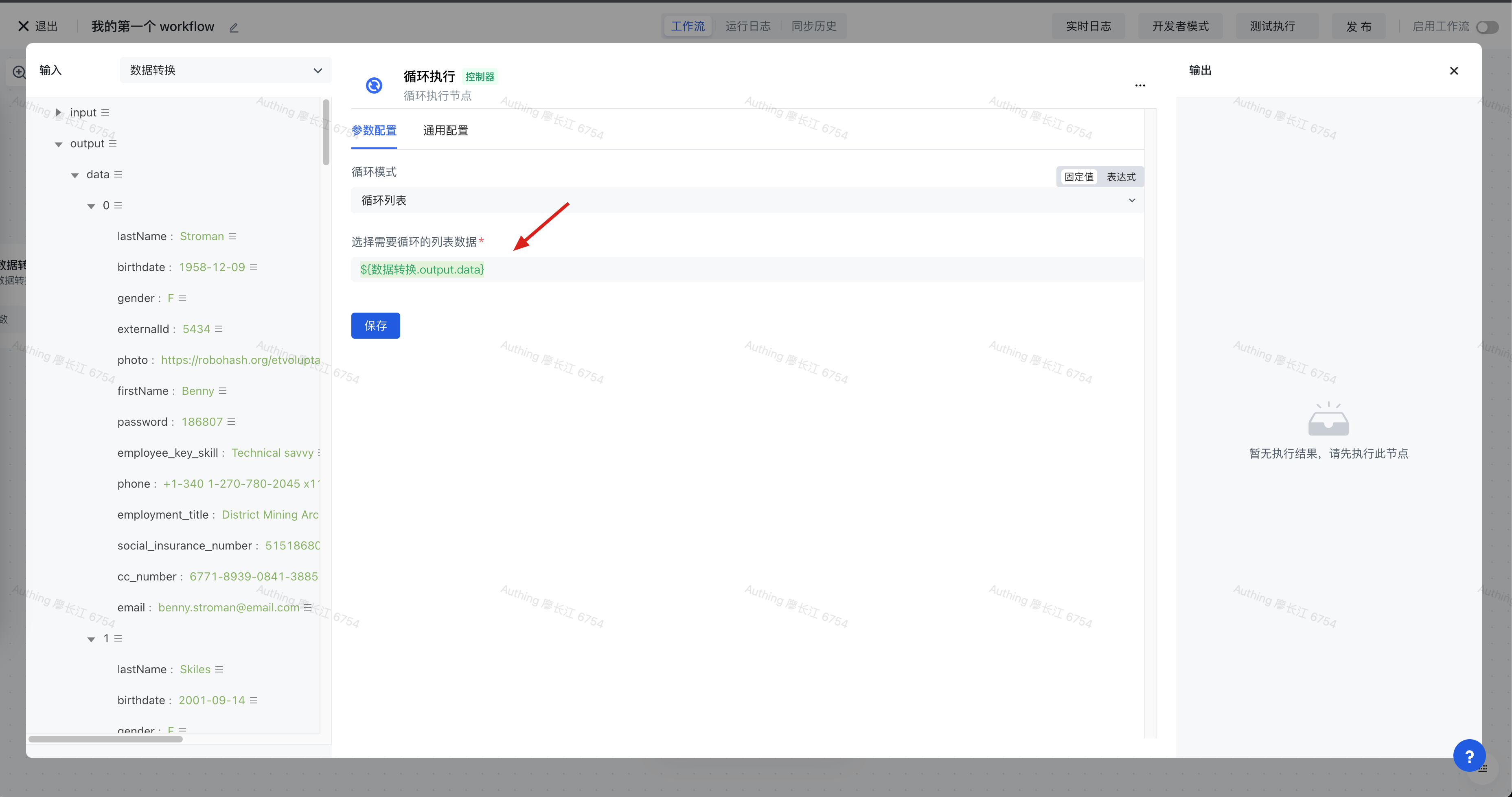 添加一个循环节点,设置循环模式为「循环列表】,并且在『选择需要循环的列表数据』中装配「数据转换节点」的输出结果。