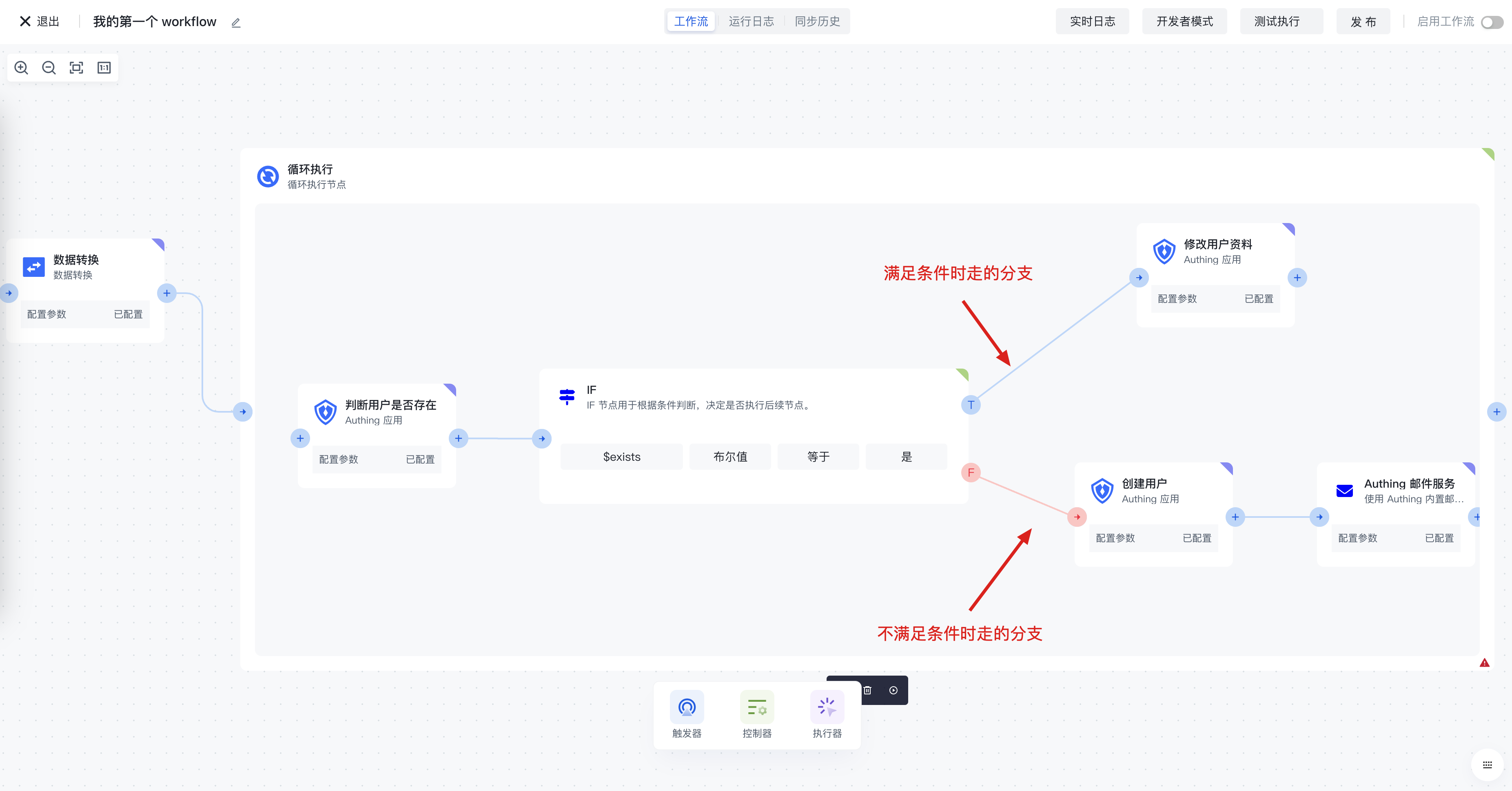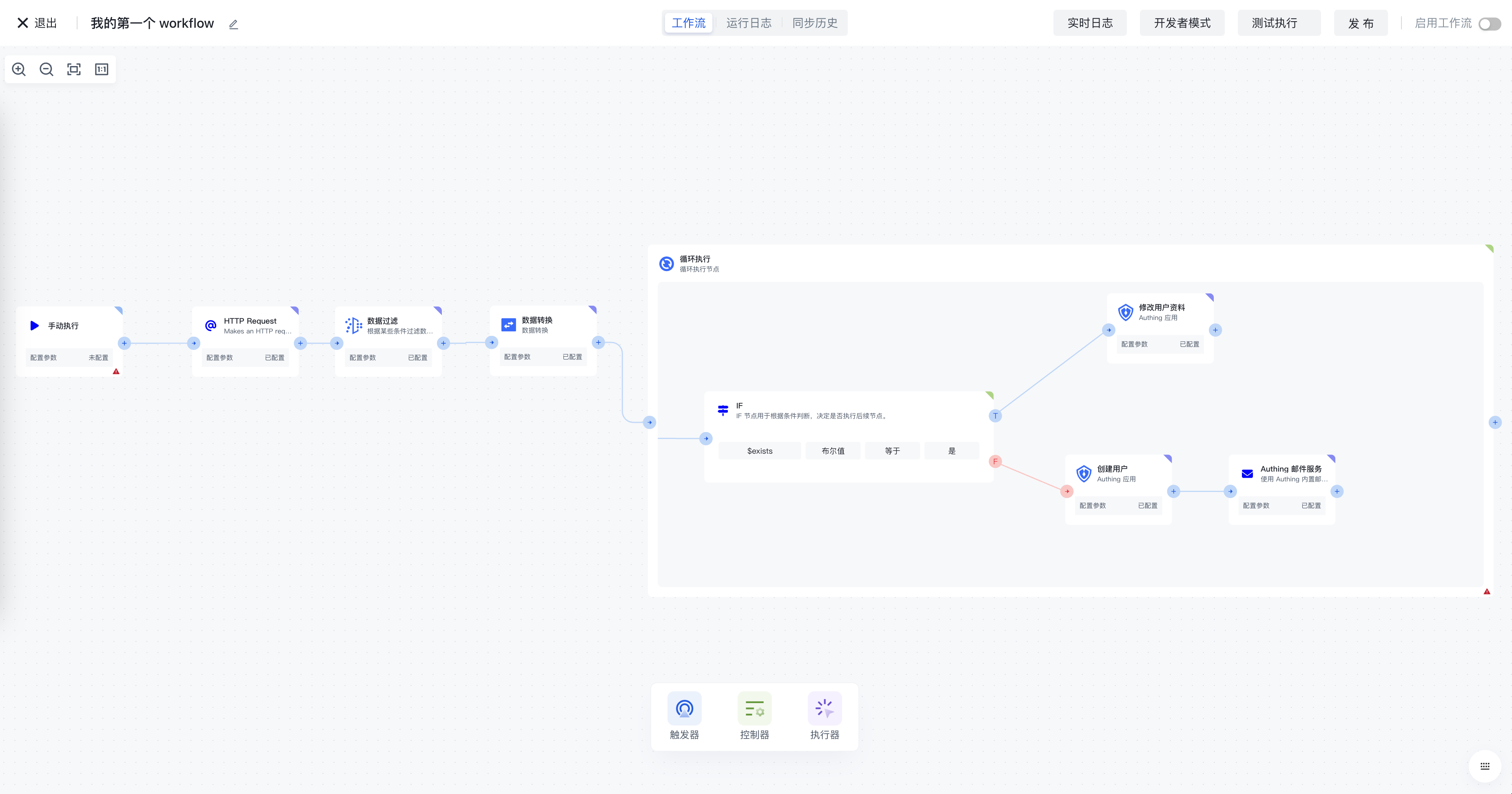最后来 Review 一下我们创建的这个流程:首先通过 HTTP 节点拉取数据,经过数据过滤节点过滤出我们实际想要的数据,然后通过数据转换节点将用户信息转换成 Authing 标准格式,最后将此转换过后的列表传入循环节点,在循环体中,针对每一条数据,先调用 Authing 节点中的判断用户是否存在方法,然后添加 IF 节点使用判断用户是否存在节点的结果作为判断依据,最后分别执行创建用户或者更新用户资料的流程。