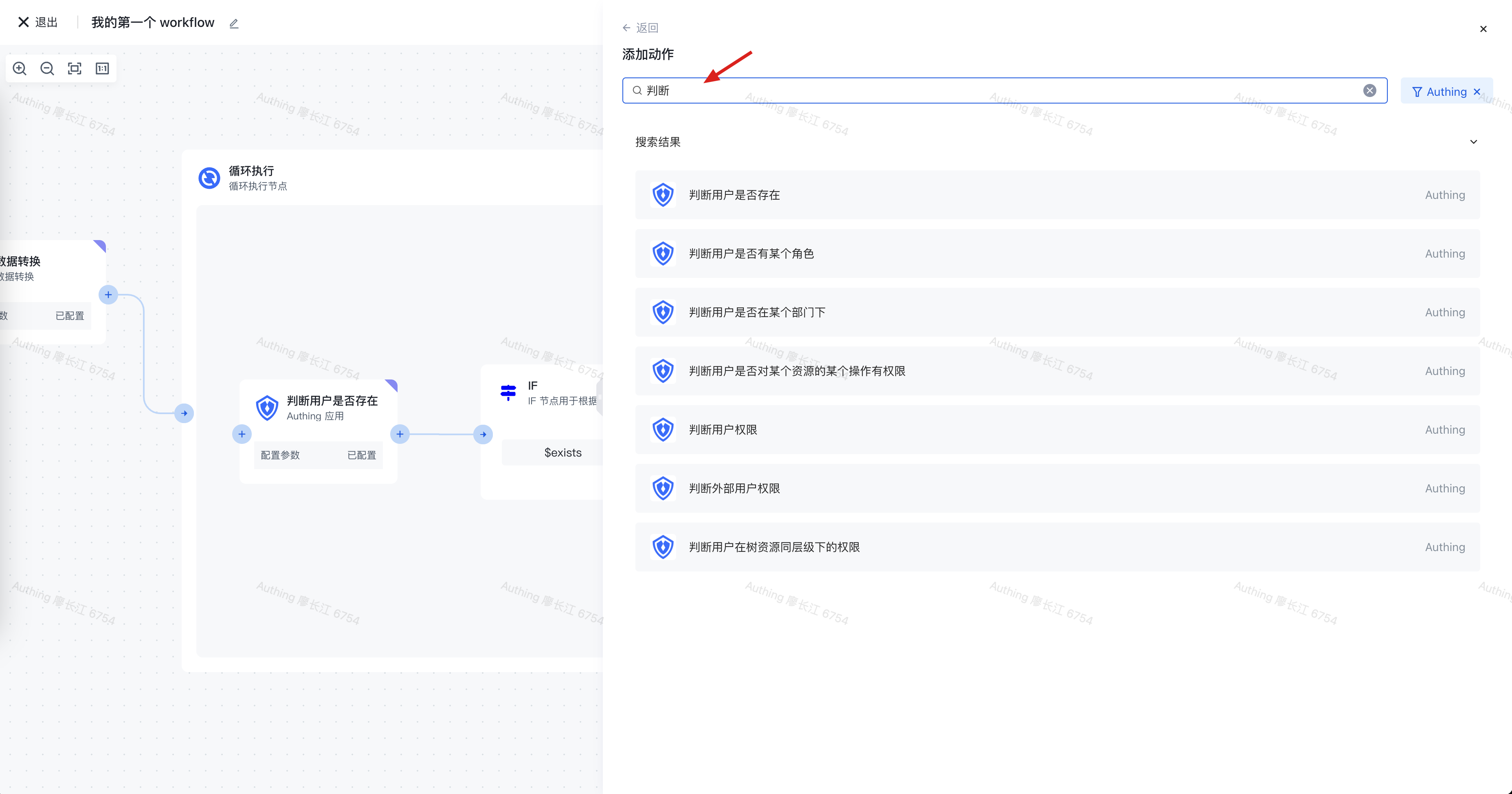 在「Authing」应用中选择「判断用户是否存在」这个动作: