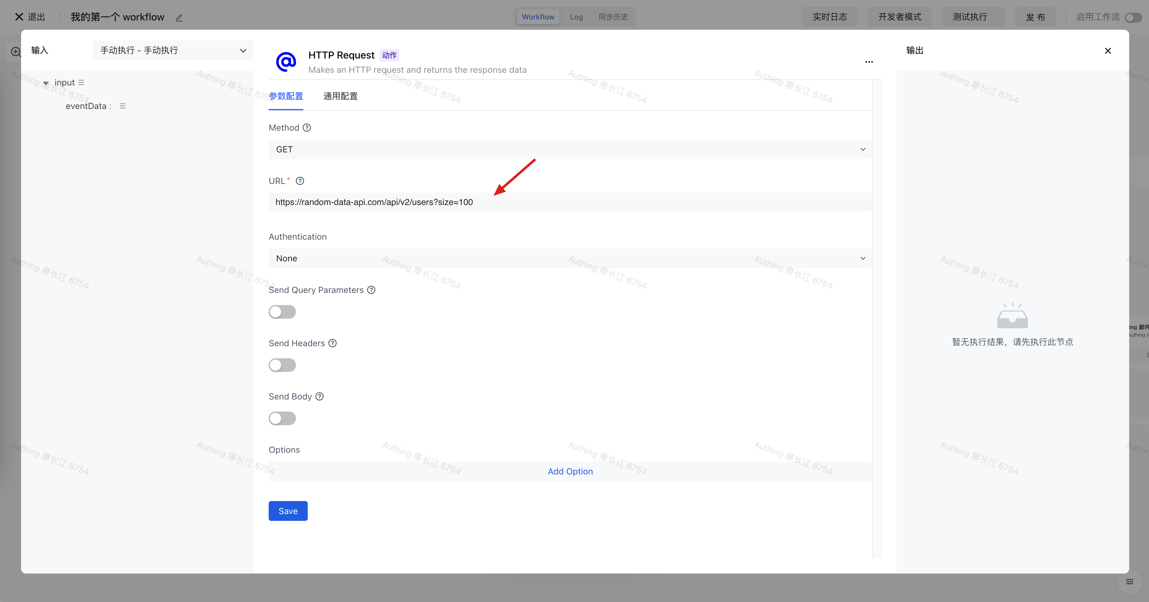在配置项的 URL 处填写地址:https://random-data-api.com/api/v2/users?size=100 (opens new window),点击保存。