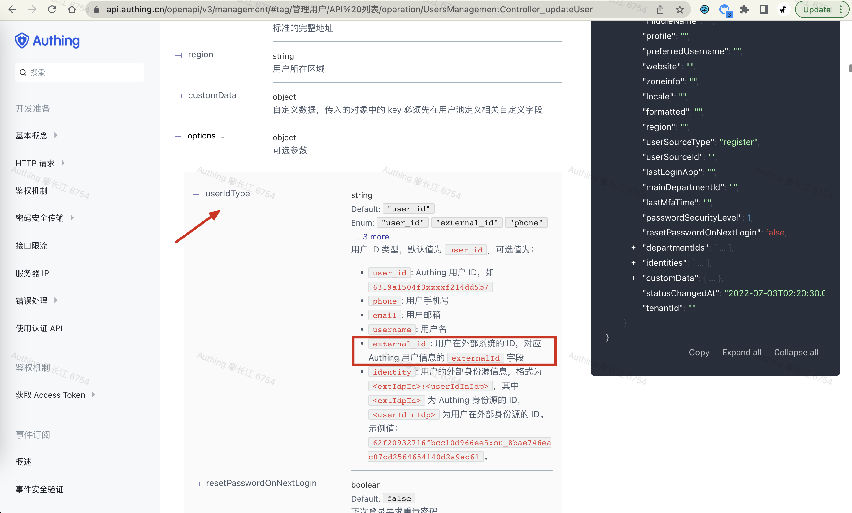 同时,在循环节点传入的列表是第三方的用户数据,不是 Authing 的用户,所以在更新用户资料的时候,无法获取 Authing 的用户 ID。好在我们的 V3 的更新用户资料 API 支持传入一个可选字段 —— userIdType,我们可以根据 externalId 字段来更新用户: