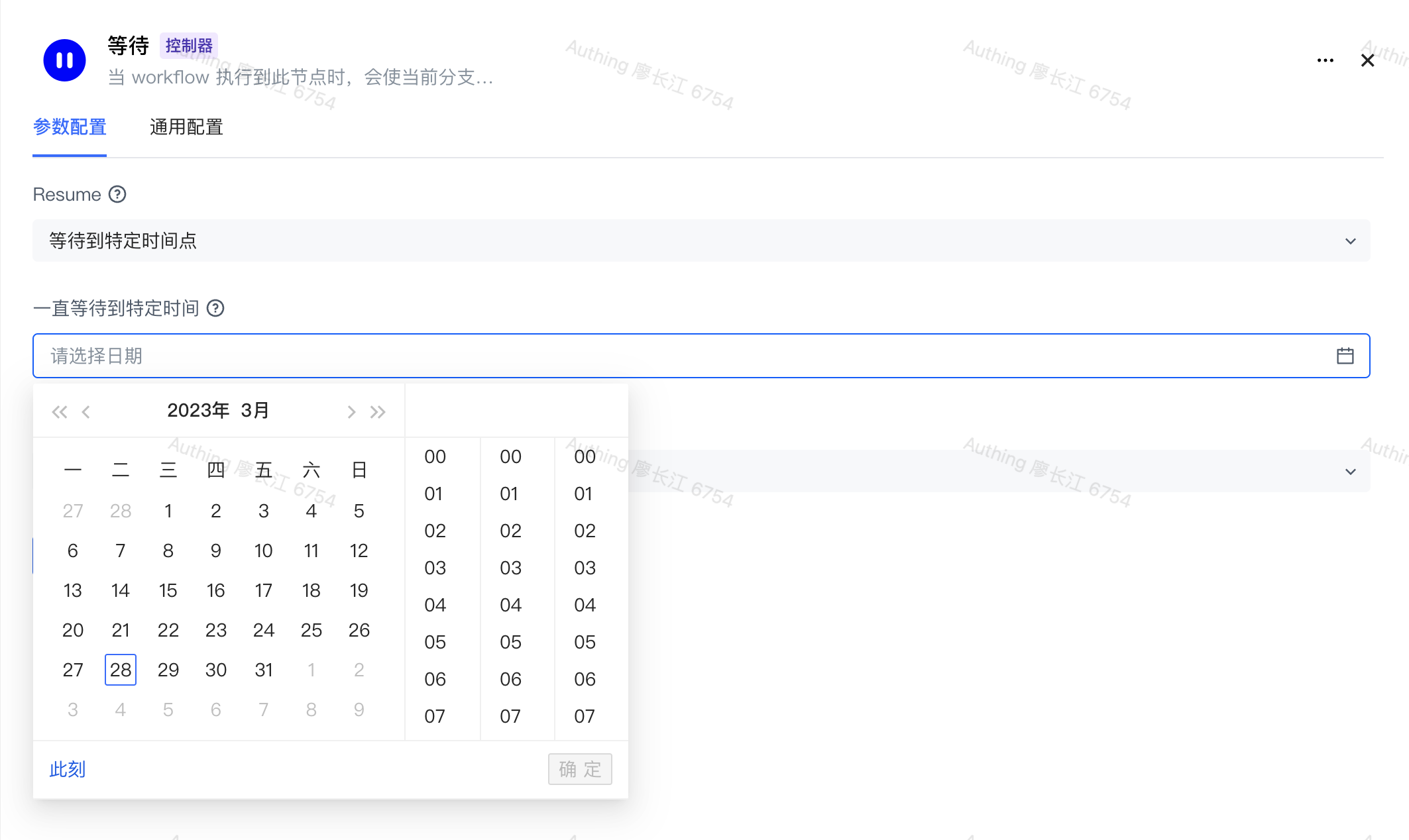 手动选择一个固定时间点,当时间达到此时间点之后,流程恢复执行。